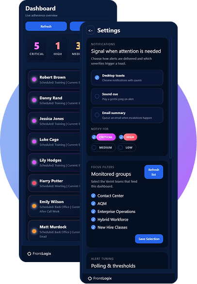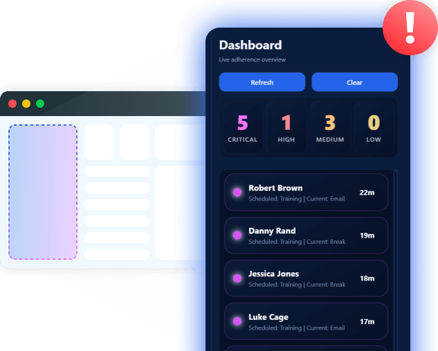 Browser-based alerts that notify supervisors the moment agents go out of adherence, without screen switching – so productivity stays high and interruptions stay low.